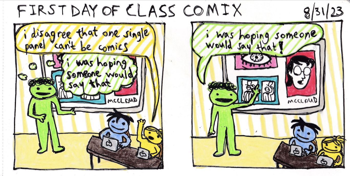 our syllabus includes understanding comics by scott mccloud, maus by art speigelman, persepolis by marjane satrapi, fun home by alison bechdel, i was seven in ‘75 by ellen forney, the art lesson by tomie depaola, and many other fantastic comics and theoretical texts.